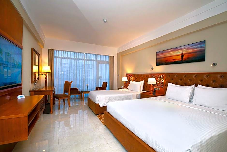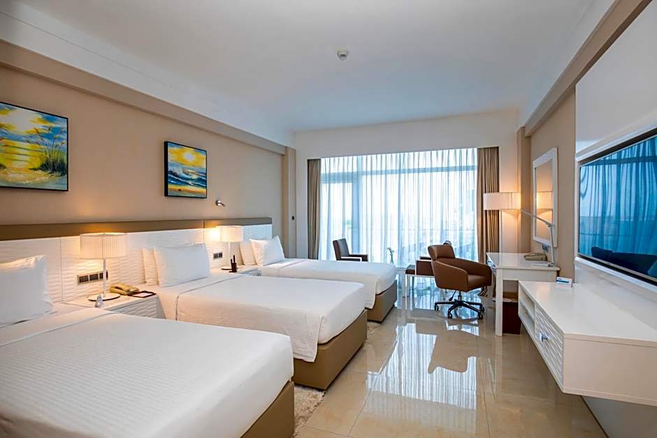 This king room has a balcony with sea view, attached bathroom. Guests have privileged access to the infinity pool & rooftop garden. Complimentary Mini-bar with soft drinks.