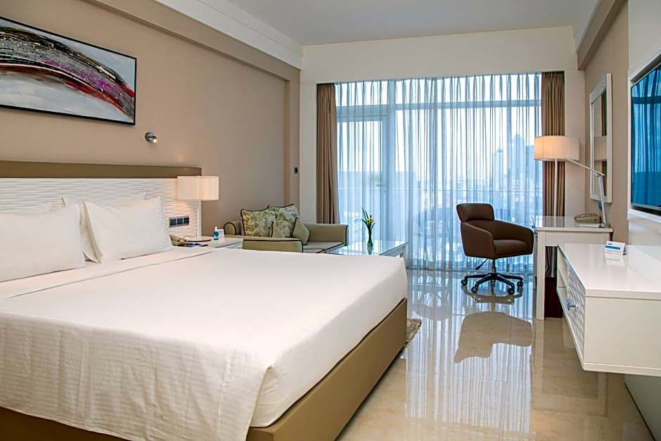 This king room has a balcony, attached bathroom. Guests have privileged access to the infinity pool & rooftop garden. Complimentary Mini-bar with soft drinks.